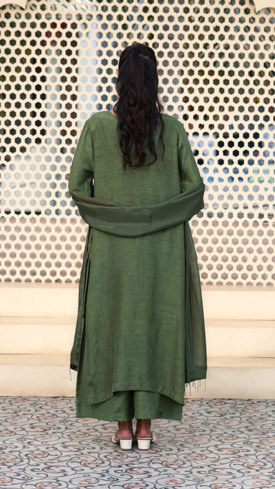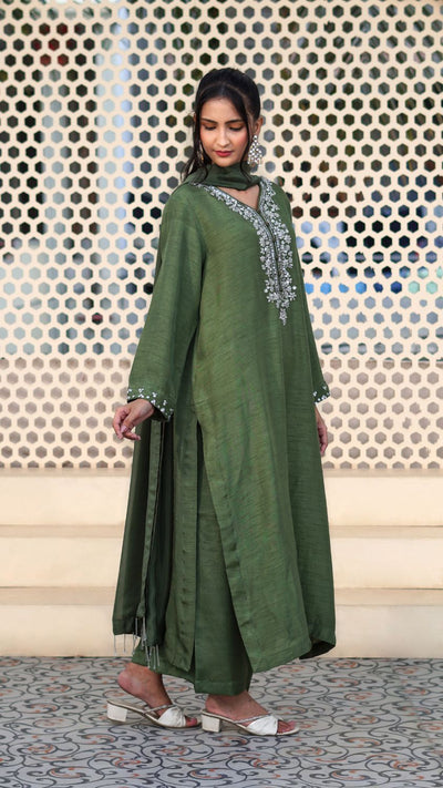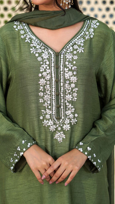 Straight - cut olive green long kurta with silver hand- embellished rhinestone motifs on the neckline and sequins hand embellished cuff edges. Matching olive green same pants. 2.75 yards Medium silk olive green dupatta with silver fringe tassels on the edges
