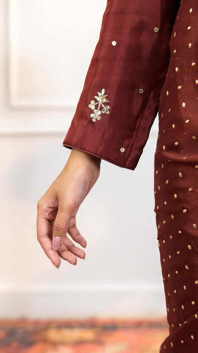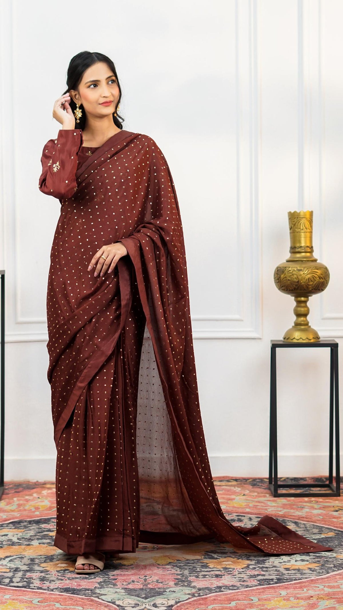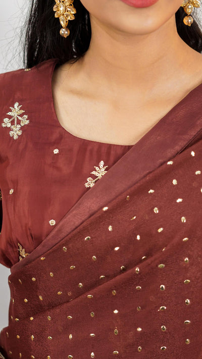 Traditional saree bronze base chiffon fabric highlighted with shiny gold Mukesh work, giving a rich metallic sheen draped over a fitted medium silk blouse featuring gold zari embroidery on the whole blouse