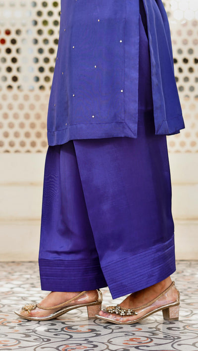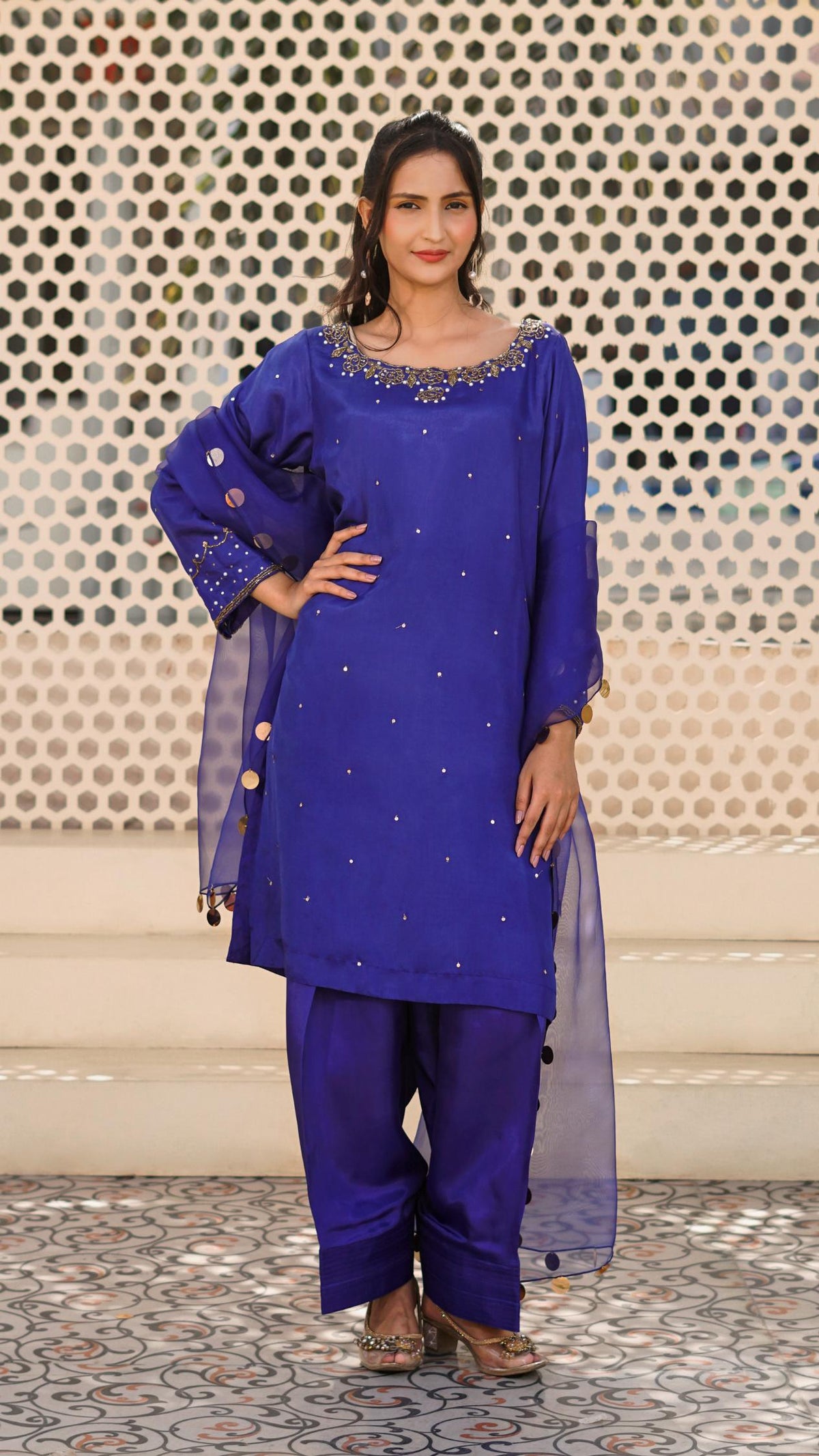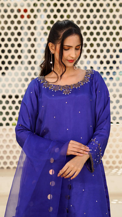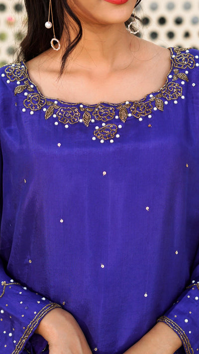 A straight -cut medium length tunic with cut- Dana and pearl embellishments around the neckline and scattered sequins on the shirt whole front; sleeves following same work technique. Matching royal blue farshi shalwar. A sheer royal blue dupata four sides edged with gold 30mm coin sequins.