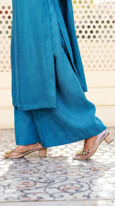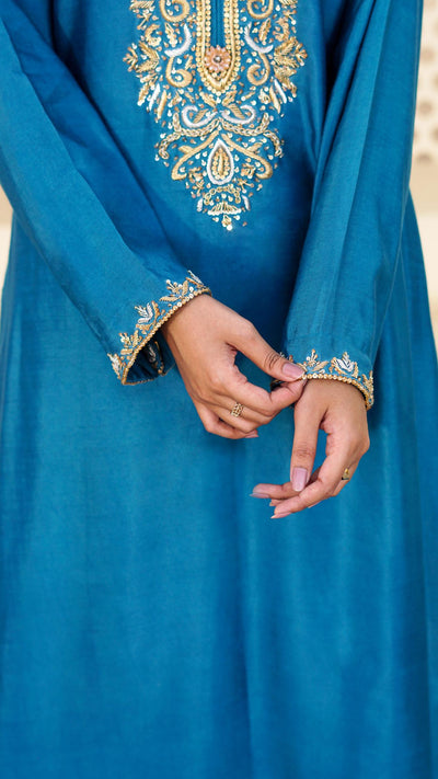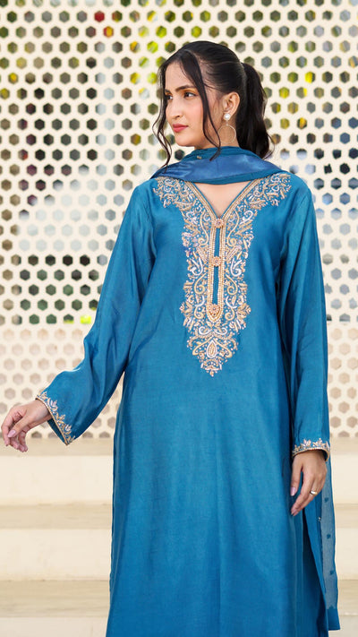 Peacock blue straight -cut long kurta with gold and silver hand embellished zardozi work on the neckline and cuffs. Matching peacock blue wide pants. Peacock blue sheer dupata with scattered gold zari embroidered motifs.